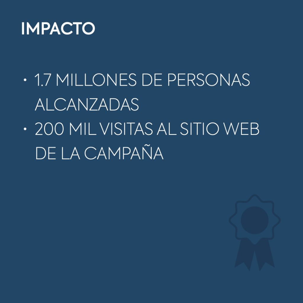 Creamos una campaña tipo pinza para crear conciencia, tanto en médicos como en personas con factores de riesgo y sus familiares sobre el padecimiento. Con un lado de la pinza, y a través de un evento inigualable de formación médica en el Estadio Azteca, le hablamos a cardiólogos, urólogos, radiólogos, angiólogos y cirujanos vasculares para crear un frente común contra la enfermedad. Con el otro lado de la pinza creamos conciencia sobre los factores de riesgo a través de una campaña en redes sociales y un sitio web que ponía a su disposición una base de médicos que ofrecían evaluaciones de forma gratuita, además de una estrategia de SEM, videos testimoniales y otras piezas para fomentar el diagnóstico oportuno.